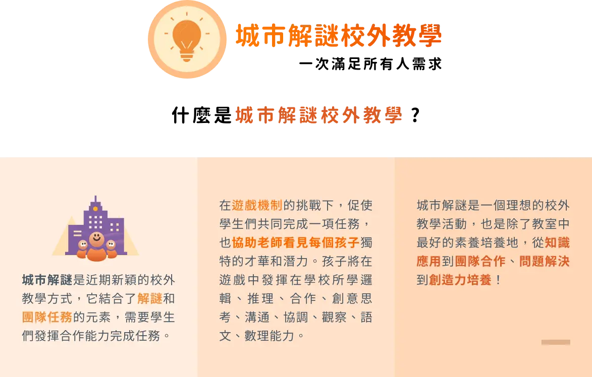 遊戲結合校外教學的創新體驗,帶領學生進行一場寓教於樂的冒險旅程。不僅可以挑戰團隊遊戲的樂趣,還能深度認識當地名勝景點,達到翻轉教育,快樂學習的絕佳效果。